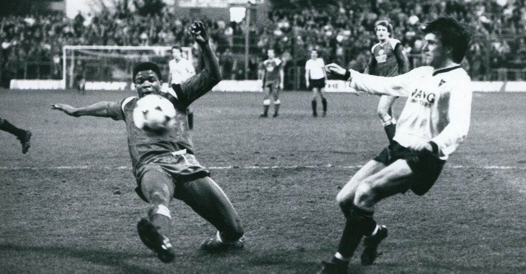 The following season the sides met at the Manor on New Year’s Day 1987, with the Yellows again scoring three goals thanks to Aldridge again, Billy Whitehurst, and Ray Houghton (see photo). The final score was 3-1.